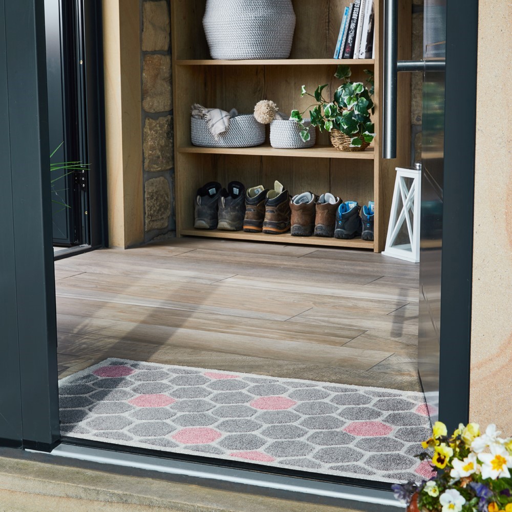 Our hand carved mats are a range of contemporary style mats that offer rich colours and on trend designs, all complemented with hand carved detail which adds depth and dimension to your entrance. Our Honeycomb mat is a hexagonal pattern in pink and grey giving a contemporary twist to your home adding style to any entrance and living space.